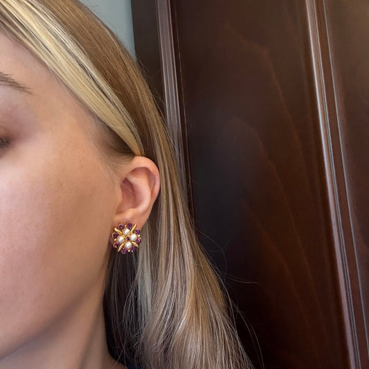 Vintage Mor Kristal Taşlı İncili Küpe