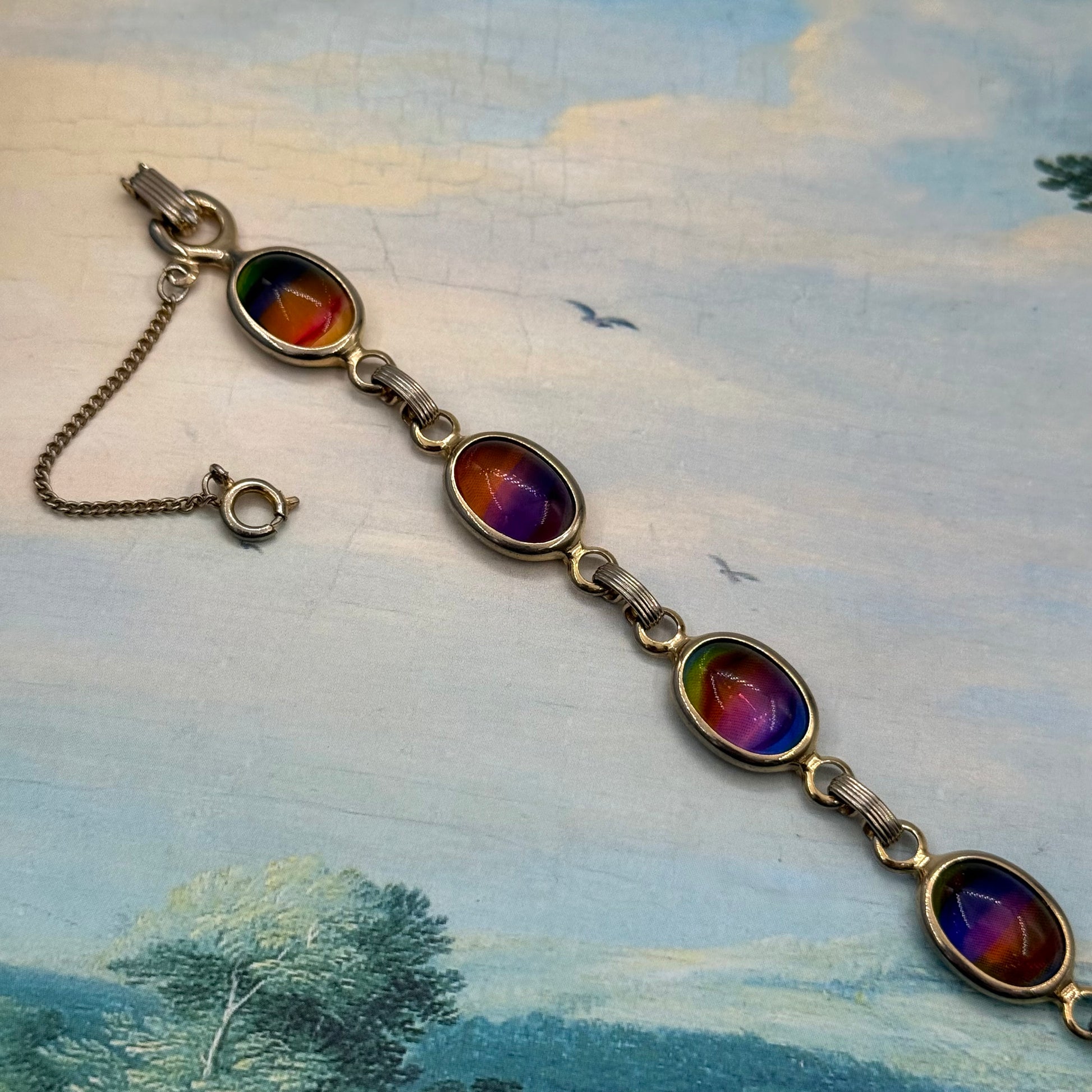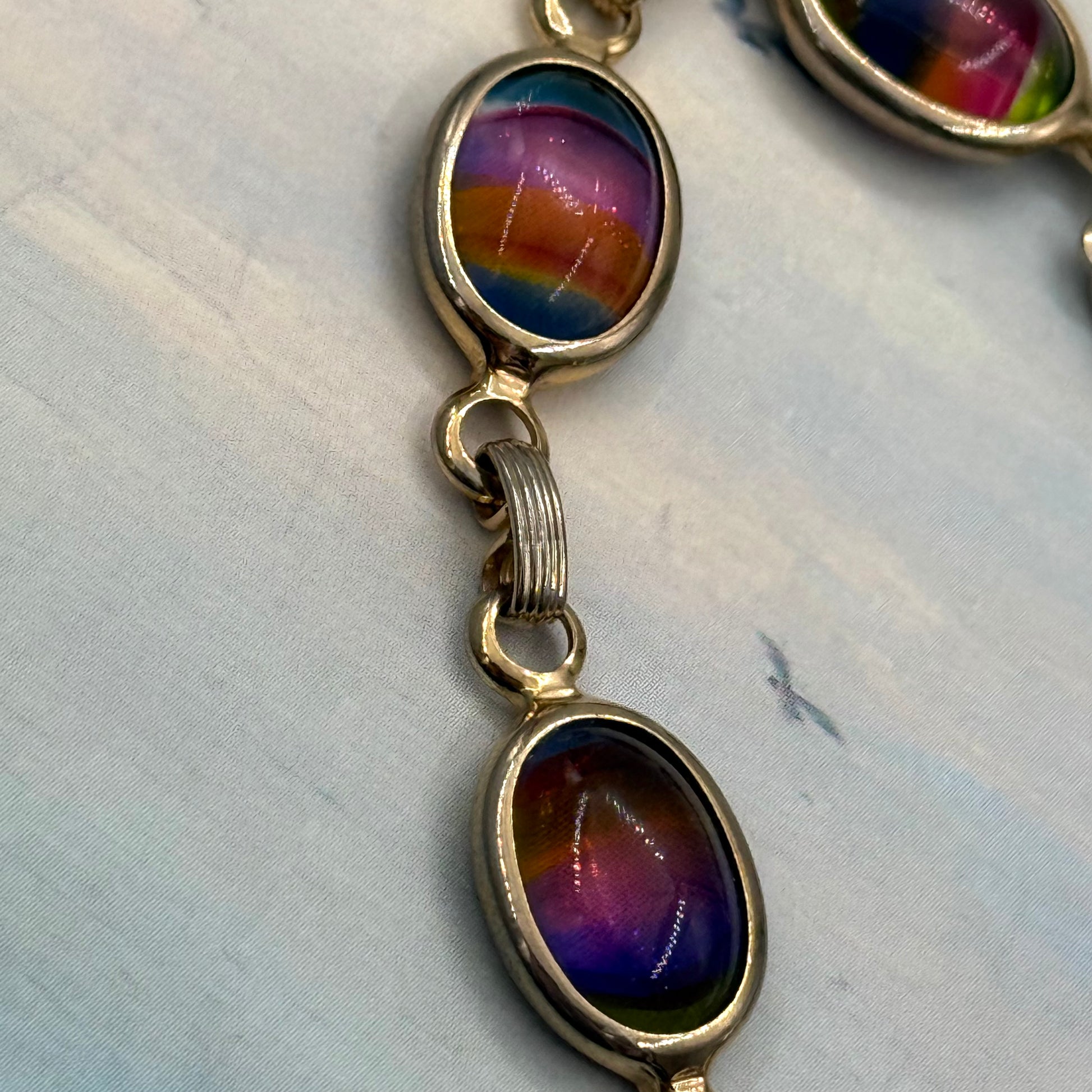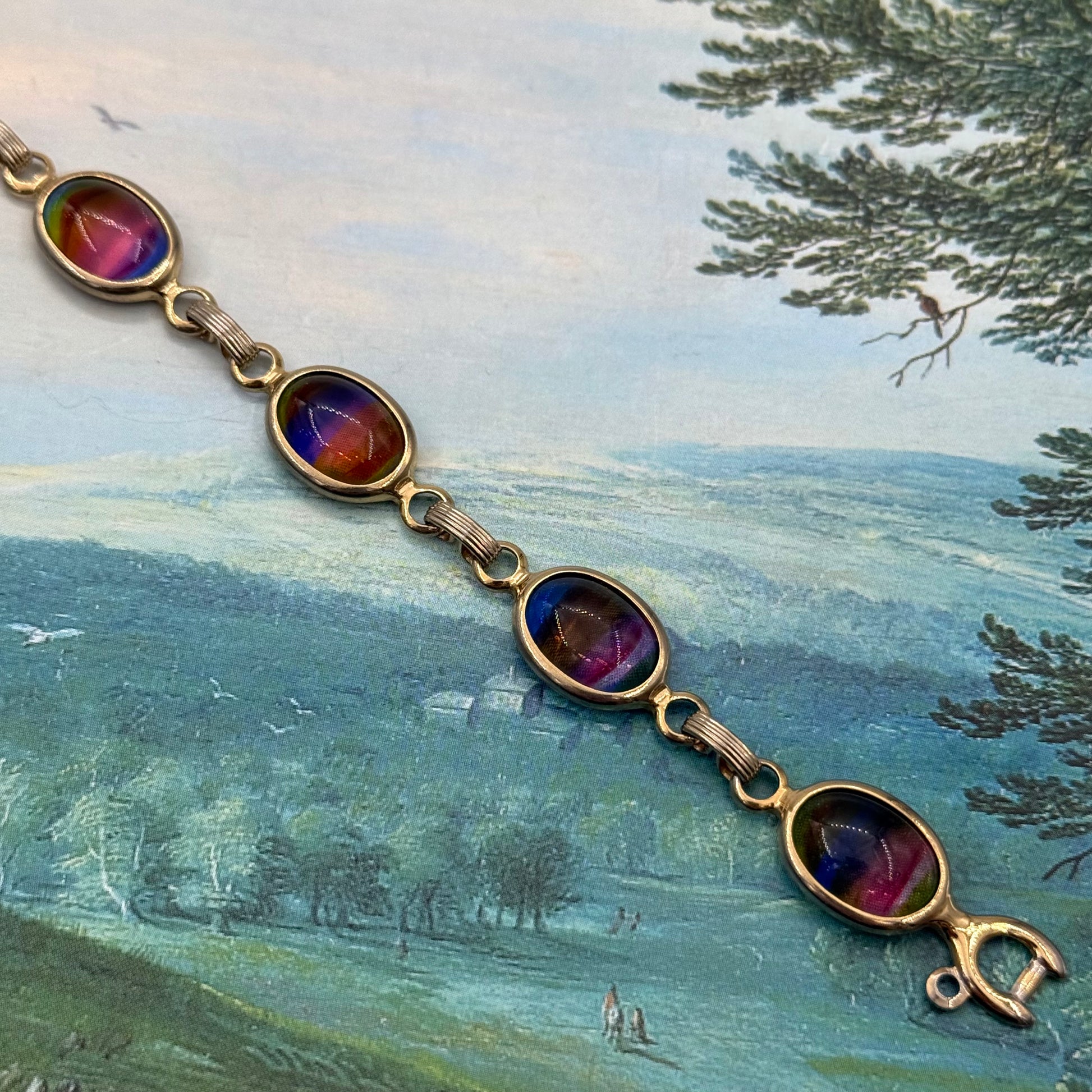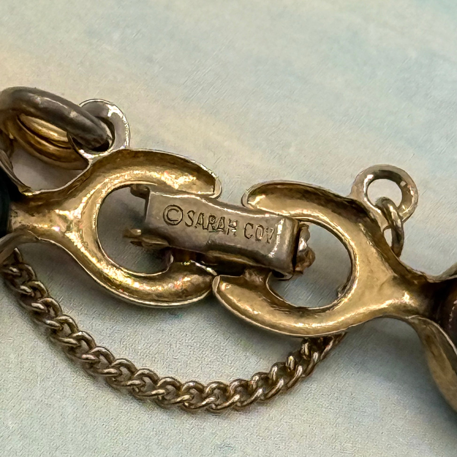 Sarah Coventry markasına ait, renkli cabochon taşlı, altın kaplama vintage bileklik. Tek elle takmayı kolaylaştıran ve bilekliğin düşmesini engelleyen emniyet zinciri mevcuttur. Kapama yerinde marka damgası mevcuttur.