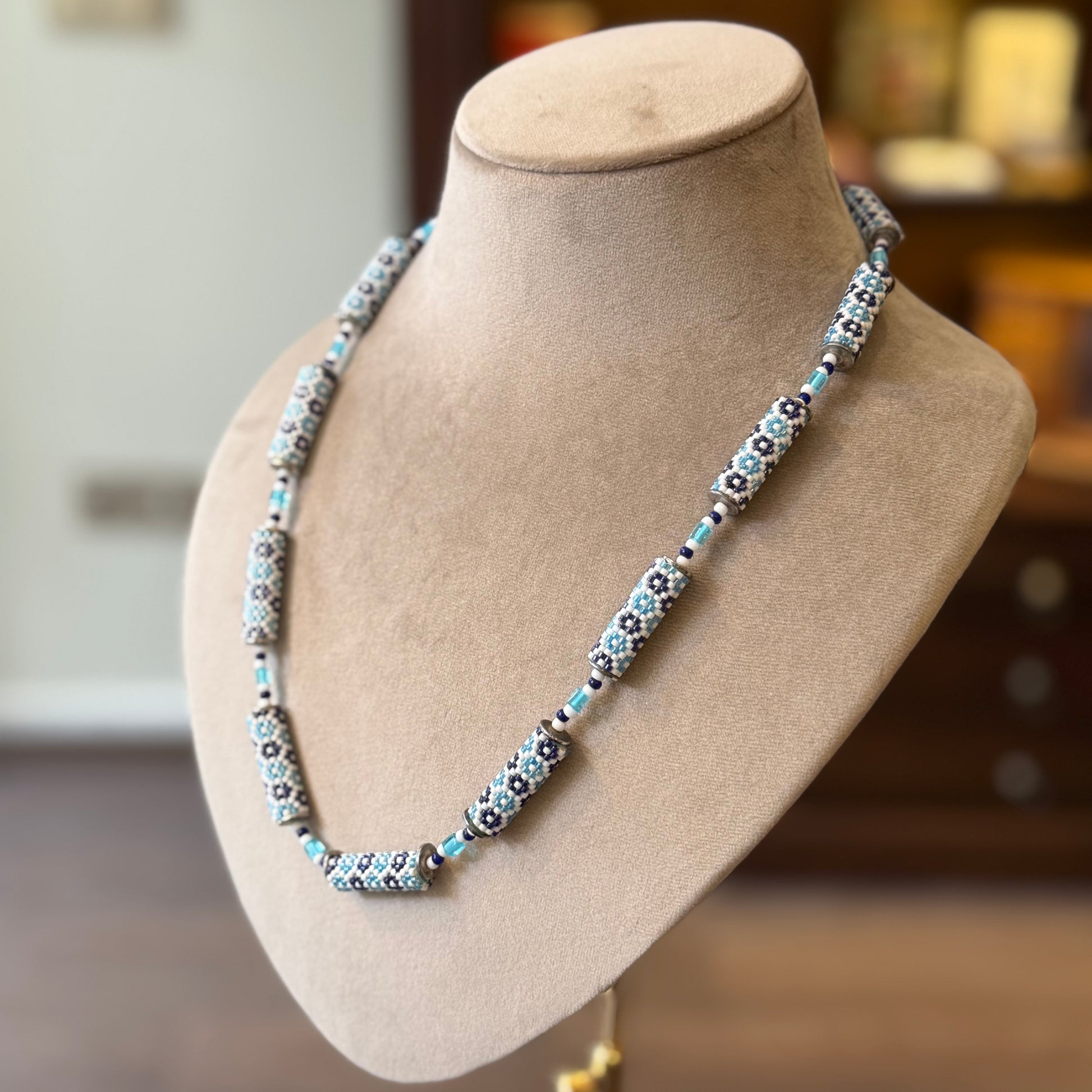 Miyuki stili boncuklarla ince işçilik yapılarak desenlendirilmiş, el yapımı vintage kolye.