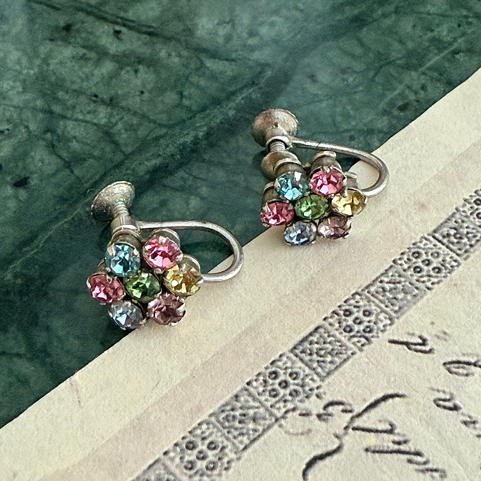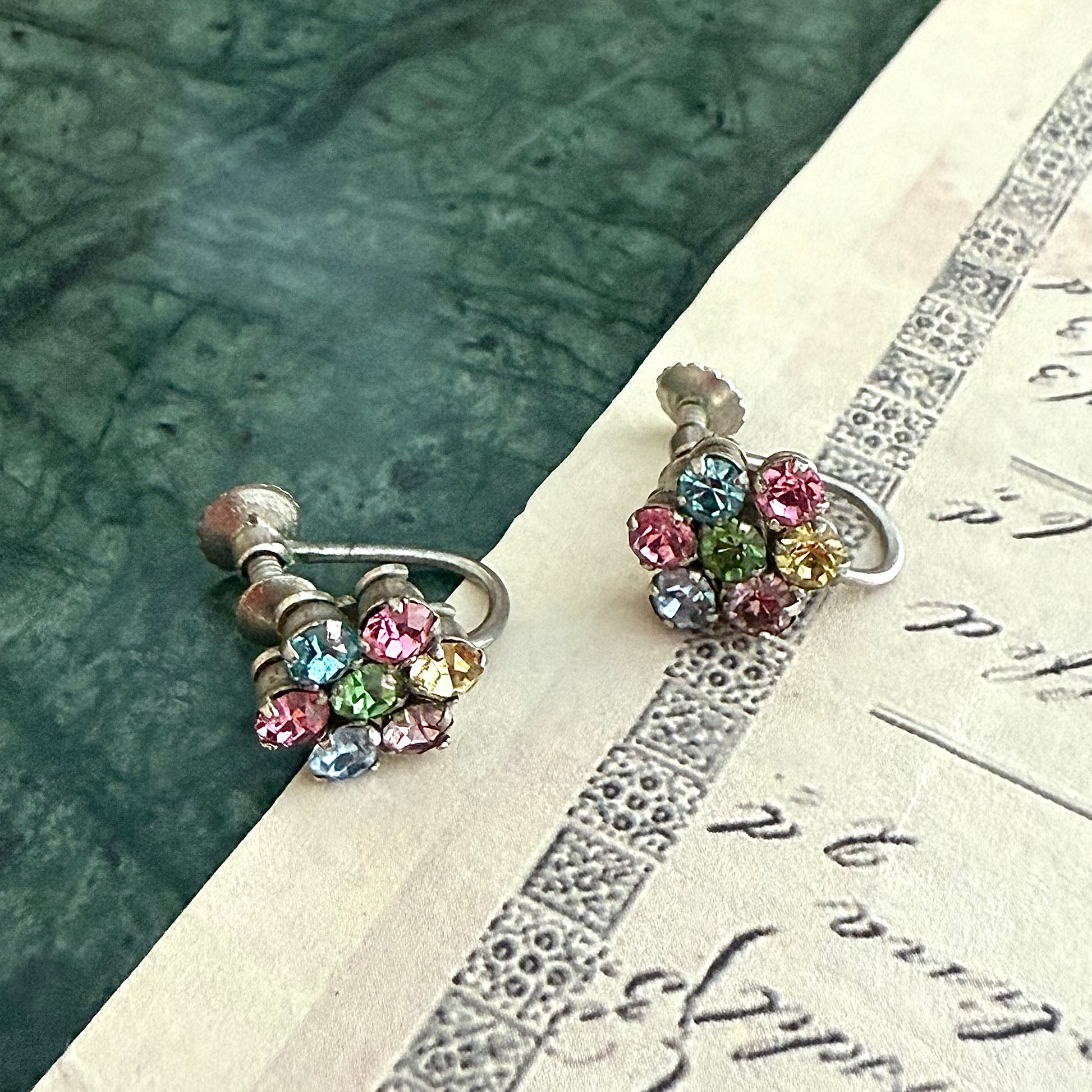 Çiçek formunda, renkli taşlı vintage küpeler. Arkaları vida klipstir.
