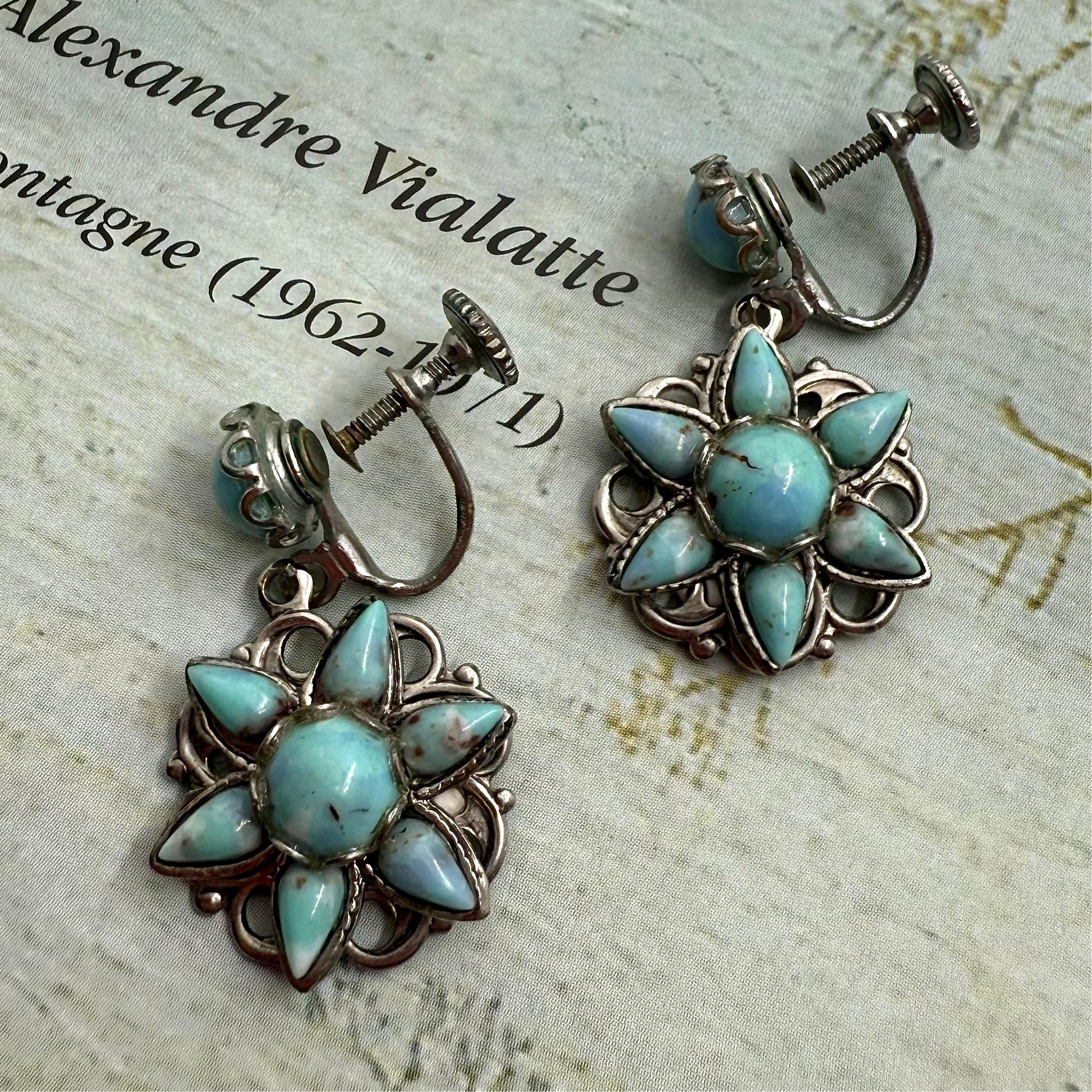 Çiçek formunda, turkuaz taşlı vintage küpeler. Arkaları vida klipslidir.