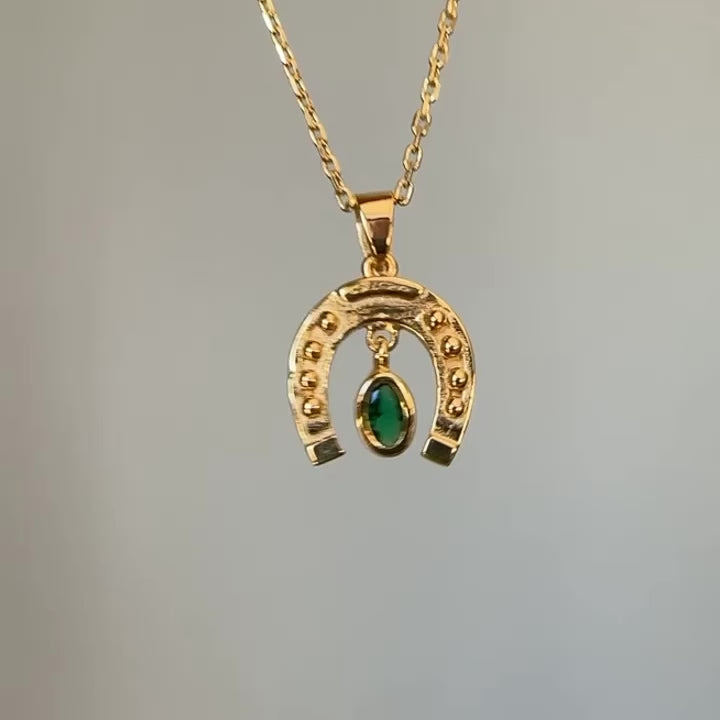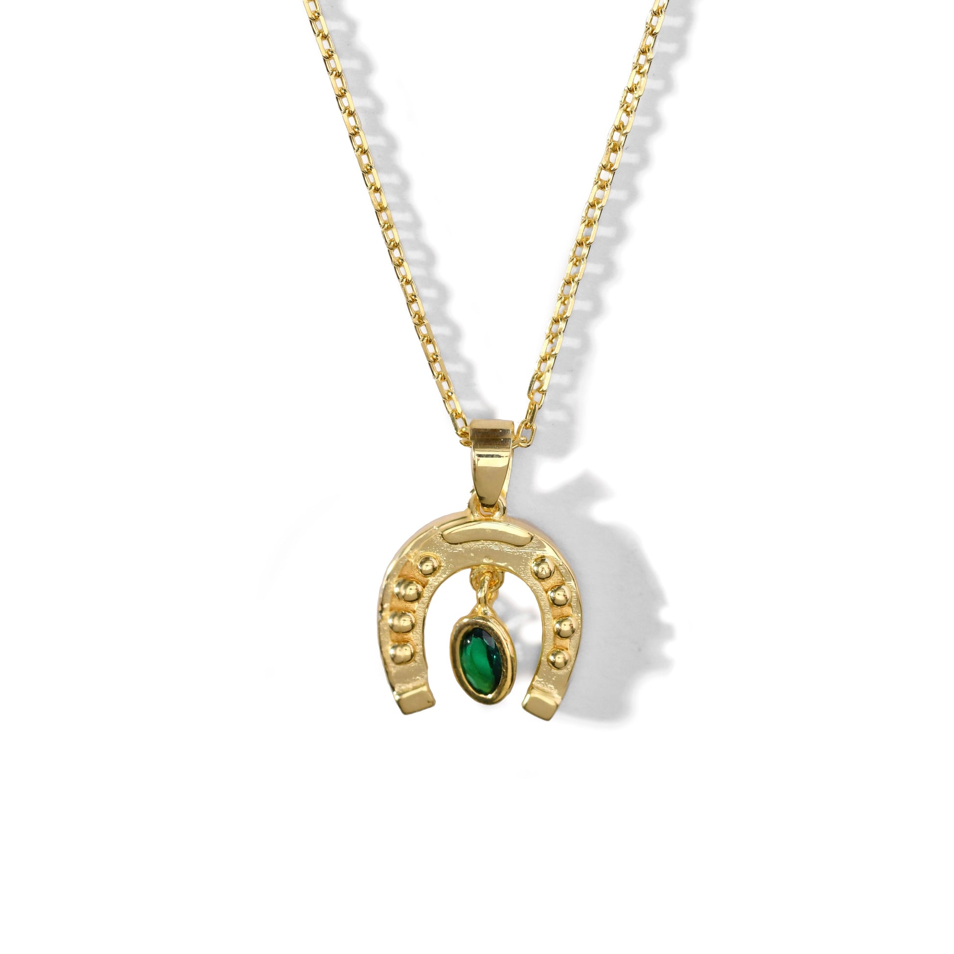 Şans getirdiğine ve nazardan, negatif enerjiden koruduğuna inanılan at nalı figürlü, oval taş detaylı kolye. Özel kadife kesesi ve koleksiyon bilgi kartıyla birlikte gönderilir.