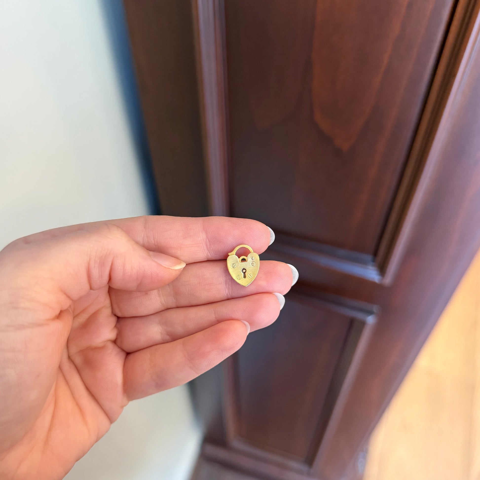 Arkasında damgaları olan, kilit figürlü padlock kolye ucu. Üst kısmı açılabilir, mekanizması düzgün çalışmaktadır.