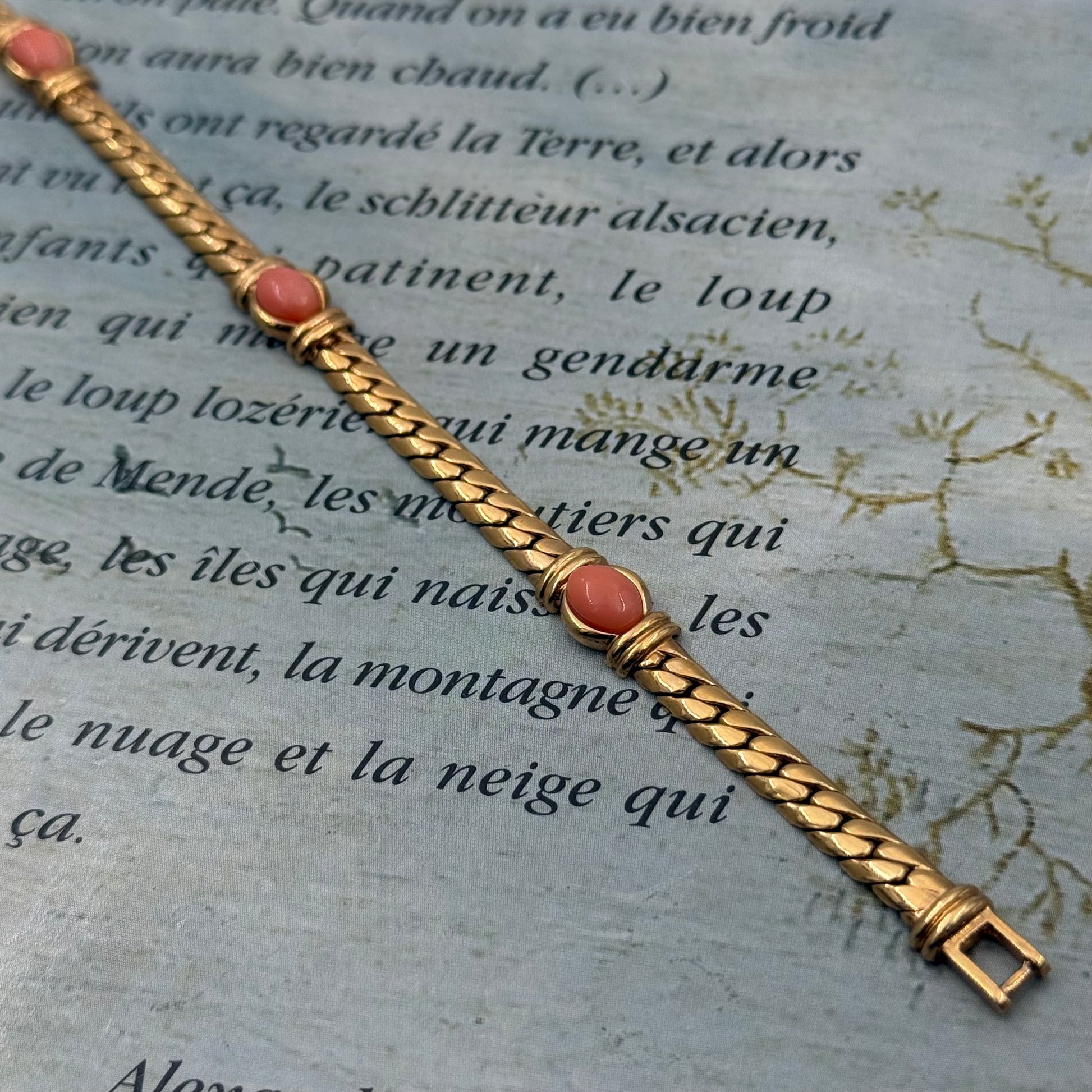 Balıksırtı zincir üzerinde somon rengi cabochon taşlardan oluşan, duble altın kaplama yapılmış vintage bileklik.