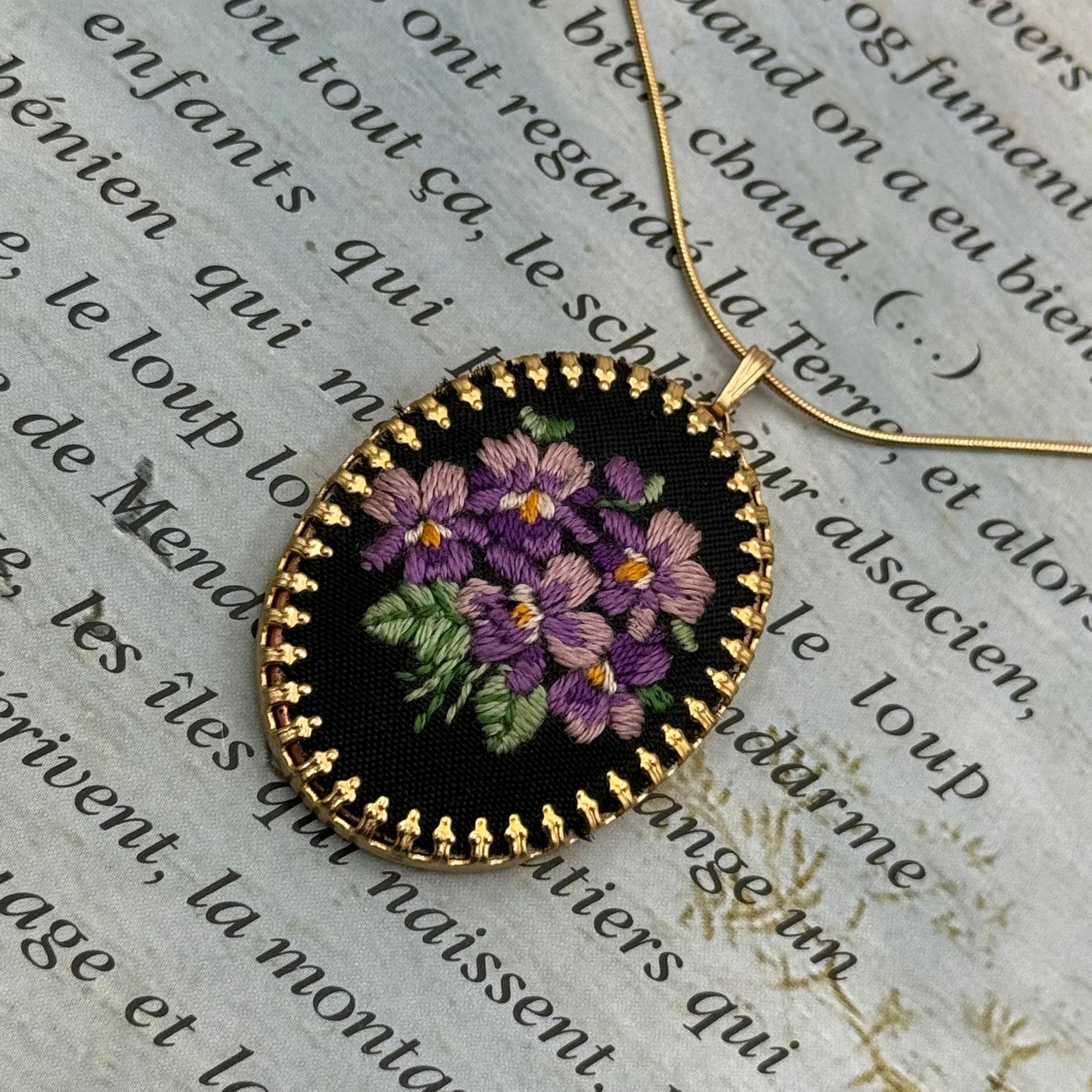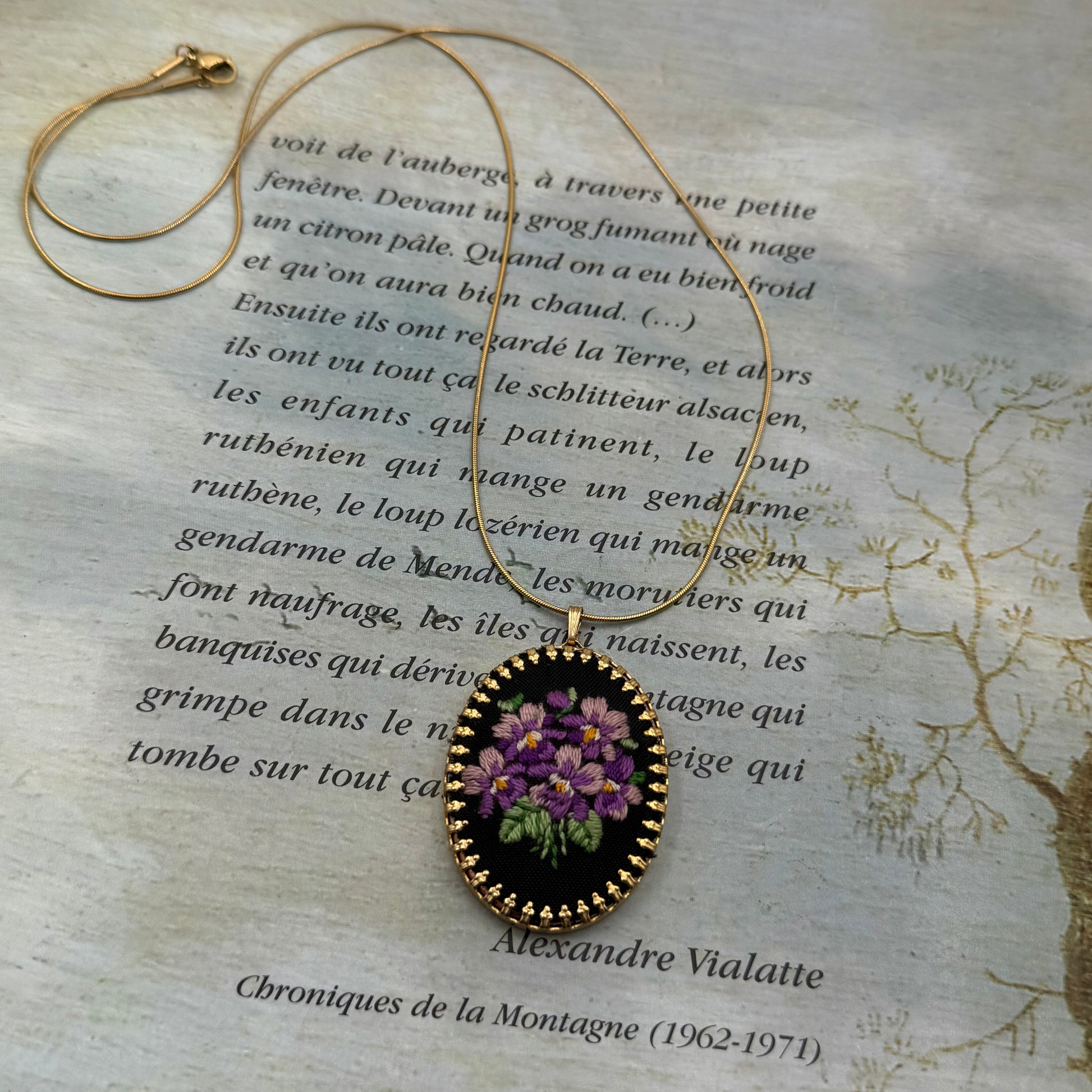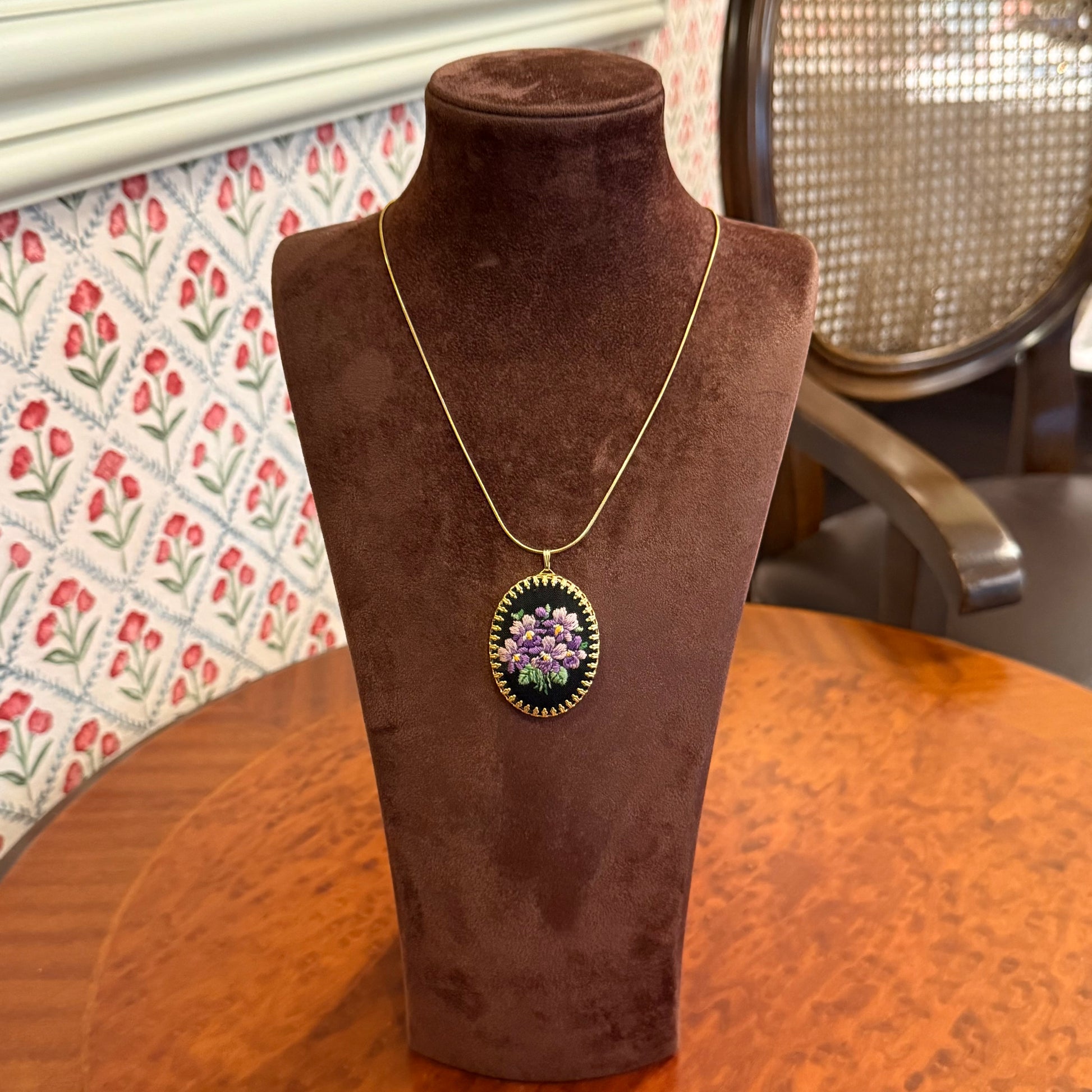 Nakış yapılarak çiçeklerle desenlendirilmiş, el yapımı vintage kolye. Uzun zincirlidir.