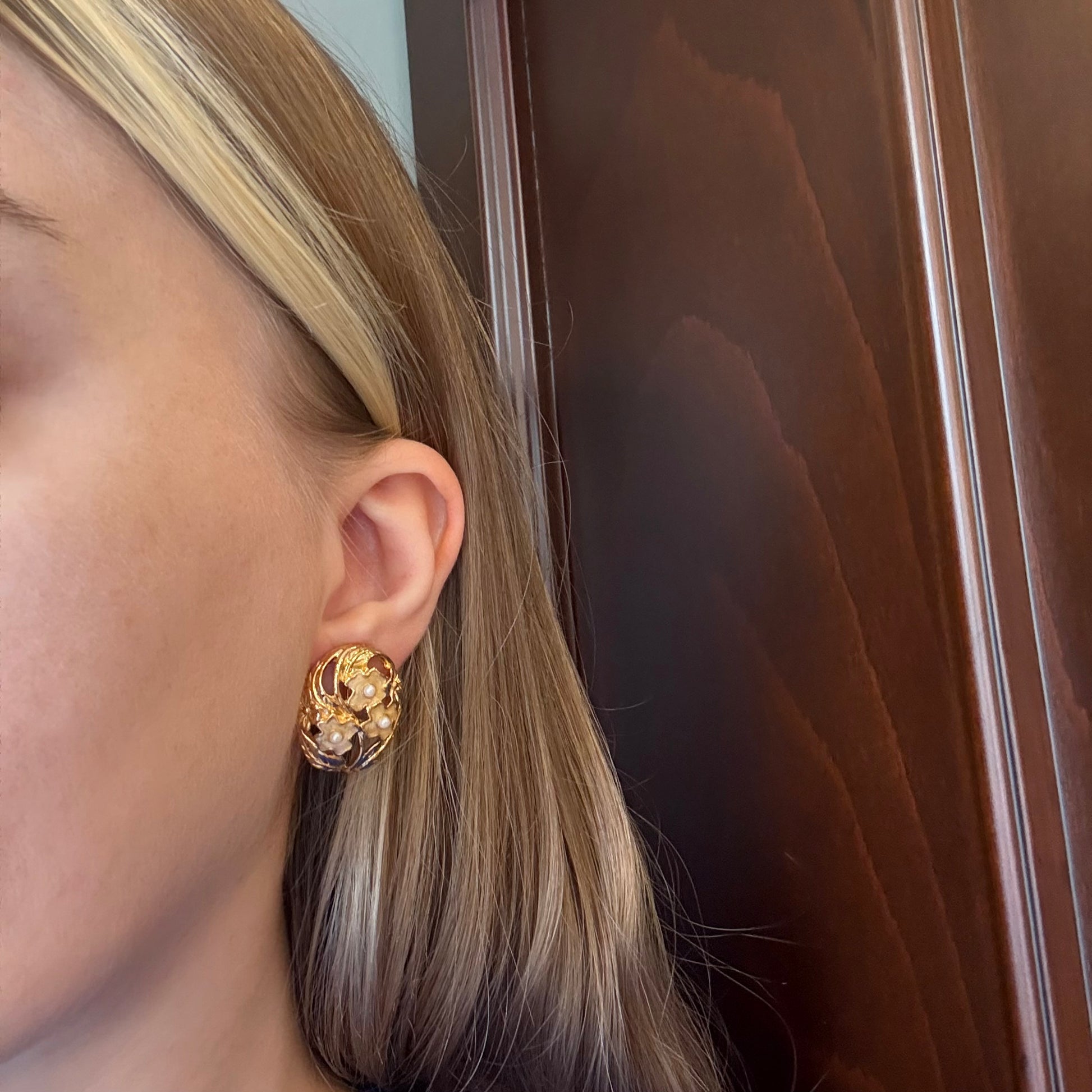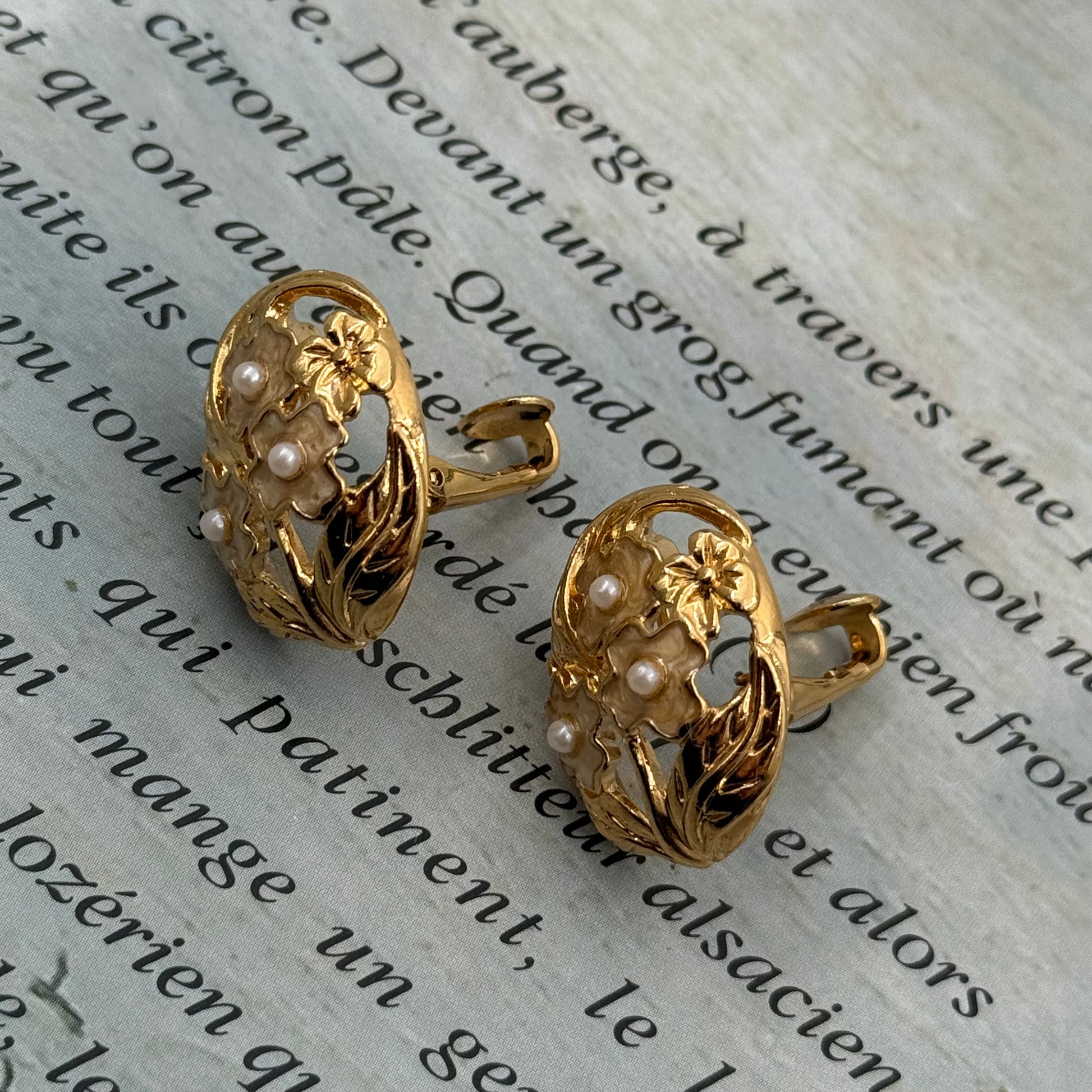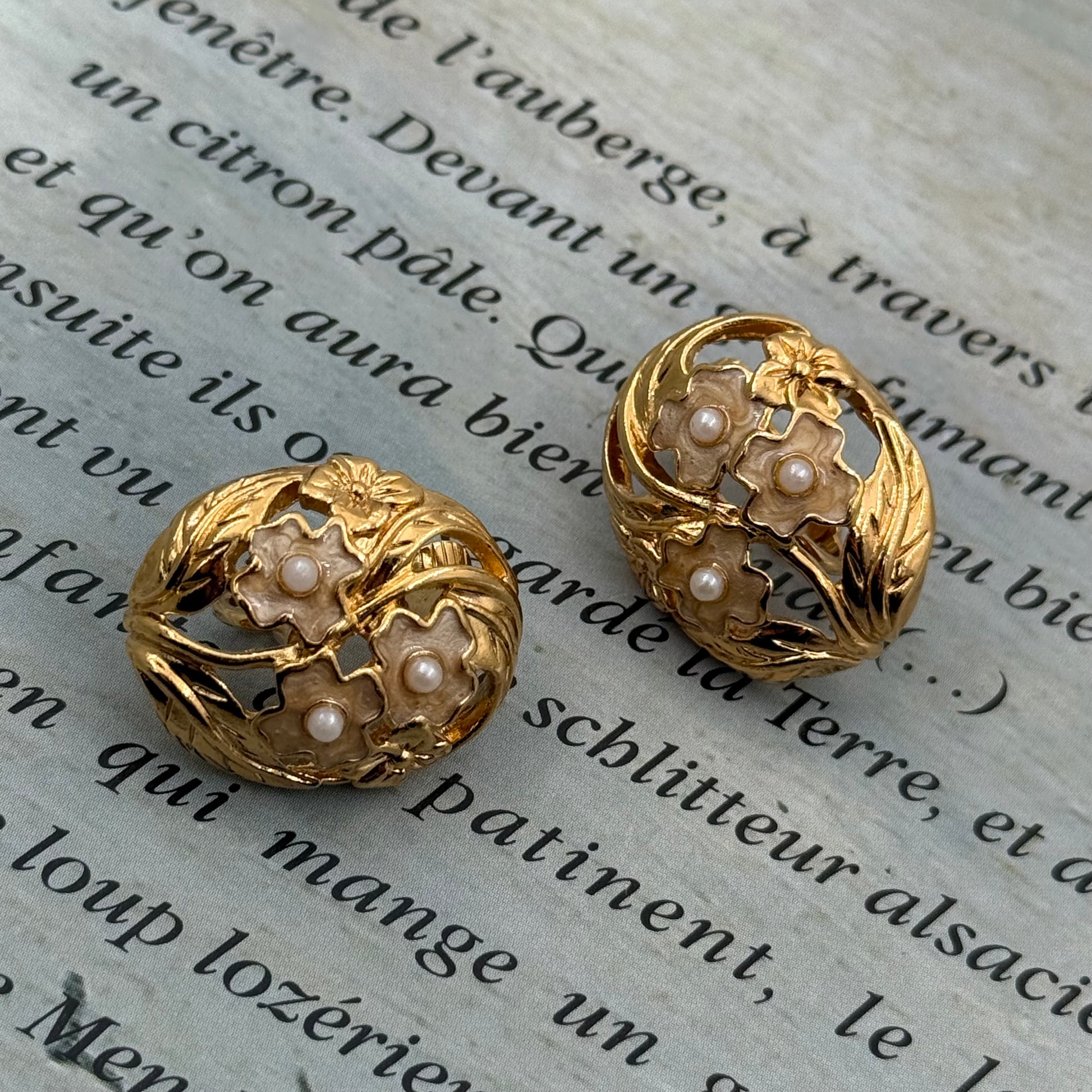 Minik incili çiçeklerle süslenmiş, orijinal tasarımlı, yüksek kalitede vintage küpeler.