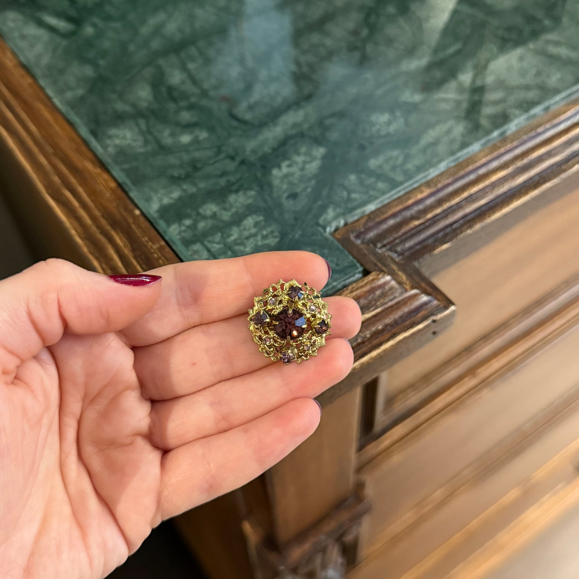 Çekoslovak yapımı, dantel gibi işlenerek tasarlanmış, mor taşlarla süslenmiş vintage broş.